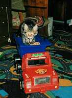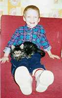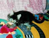 Периодически мы ездим на Птичий рынок поглядеть на разное зверье. 25 февраля 2002 г. во время очередного обхода мной был замечен чудный пушистый («вонючий») комочек. Посмотрел, посмотрел и …уехал. После этого не мог найти себе место и, всю следующую неделю с утра и до вечера только и делал, что рассказывал о нем жене. К следующим выходным было решено- поедим, посмотрим на это «чудо» и если он понравится всем –купим (если он конечно еще не продан). К нашему (его?) счастью он был не продан, сидел в своем лукошке. При более подробной беседе и рассмотрении он оказался мальчиком, т.к. жена была согласна на покупку только кота. Имя было выбрано заранее и однозначно - БОНЯ. Это был мой подарок жене на 8 Марта.