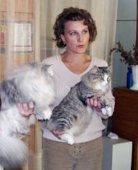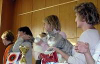 20.09.03 состоялась выставка клуба «Москва».На ней были представлены многие породы, такие как: британские короткошерстные, абиссинские, шикарные персидские, неотразимые бенгальские с фосфорическими глазами; участвовала сильная восточная группа: корниш-рексы, ориенталы, покорившие немало сердец экспертов… Принимала участие и редкая порода «сноу-шу». Выставка была полна острых ощущений и переживаний. Вот кое- какие наблюдения за ходом выставки. Некоторые животные вели себя так, будто они тут все знают, некоторые, медленно, но верно сползали со стола эксперта, желая спрятаться куда-нибудь, а некоторые пытались кого-нибудь укусить… Другие мирно спали. Все были заняты своим делом… Лишь один раз абиссинский котенок использовал секретный ключ, под названием «коготь», сумел-таки открыть клетку, но, испугавшись, забился под стул. Хозяйка, отлучившаяся на минутку, бегала и причитала. Вскоре котенка нашли и водрузили на место. Тот, после долгих переживаний, заснул и больше не порывался выйти наружу… На ринге развернулась острая борьба, всего лишь две девочки представляли породу «курильский бобтейл». Молодая аборигенная порода, которой стали интересоваться, ее стали замечать, приглашать на Best. Одна из них, из питомника «Крошка-Флак», расписная серебряная черепаха на белом - шикарная Боярыня. Другая - Калинка-Малинка из питомника «Малютка Боб»- черная серебристая пятнистая на белом. Обе кошки были прекрасны по типу в замечательной выставочной кондиции, но одна выступала в короткошерстной группе, а другая - в полудлинношерстной. ОБЕ ДЕВОЧКИ БЫЛИ ПРИГЛАШЕНЫ НА BEST!!!… На Бесте эксперты с восхищением смотрели на животных и не могли сделать выбор… В конце концов, выбор был сделан: I место заняла шикарная персидская черепаховая кошка; II место- курильский бобтейл - Калинка-Малинка, выступающая в полудлинношерстной группе; III место- ориентальный кот, цвета браун тэбби, IV место-экзотическая черепаховая кошка на белом. Best давно закончился, а в душе еще переживали…