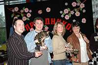 На данной выставке всеми нами горячо любимый ФИЛЛ РОБИНЗОН занял почетное 2-е место среди взрослых животных, уступив в результате закулисных интриг самарской кошке-канадскому сфинксу (у которой и шерсти то нет, ХА-ХА). Не менее любимая АНФИСА из какой-то деревушки (Не зря Ломоносов говорил, что богатство России будет преумножаться Сибирью-крепка наша провинция) также заняла 2-е место в классе котят, затмив всех своим замечательных черепахово-мраморным да еще и с белым окрасом. Вот так наши кимберлитовцы отметились в братской Белоруси. Сибирский кот Боня выйграл титул Best Premior выставки. С Вами был Ваш В.Ильиных