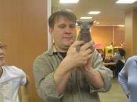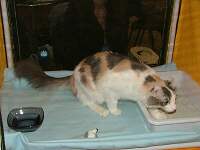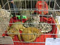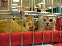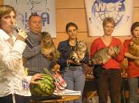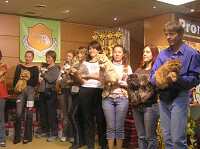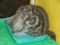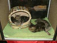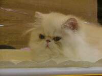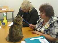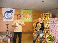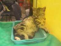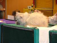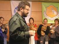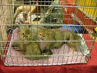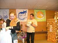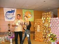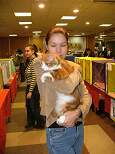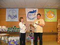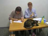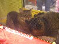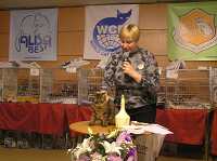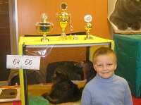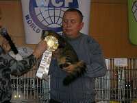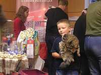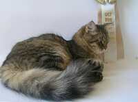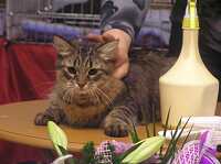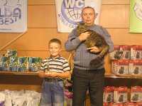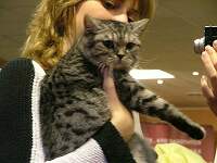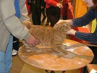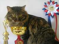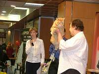 Выставка 17-18 сентября. Для начала напоминаю, что это у Тавра первая выставка, в которой он участвовал уже как взрослый кот. В июле на "Москве" еще были в юниорском классе, а теперь уже все. Первый САС. В общем, задача была простая: от обоих экспертов получить по титулу. Правда, в самом начале, полистав каталог, стало понятно, что задача уже выполнена. Потому что, как известно, на один титул могут претендовать животные одной породы, возраста, пола и окраса. Так вот. Из курильских котов окрасом "красный мраморный с белым" в классе САС обладал только Тавр. Был еще один кот такого же окраса, но он был сильно выше классом, кажется, уже CAGCIB . В общем, оставались только технические детали: дождаться приглашения на экспертизу и не умереть от скуки. Как в первый день, так и во второй. Коту-то пофигу, он дрых в палатке и ухом не вел. Только когда его вытаскивали, орал благим матом и вцеплялся в людей всеми четырьмя лапами. Хорошо, что когти ему подстригли. Первый день С утра кот, почуяв неладное, с утра заныкался на самый высокий шкаф, откуда его было очень трудно достать. Расчет был, в общем, верен. Но так и не оправдался толком, ибо кот был изгнан на пол подручными средствами, загружен в переноску, а потом в машину. Второй день В этот раз грумингом над котом никто не издевался. Перед экспертизой я слегка причесала ему манишку и штаны, а спина со вчерашнего была причесанная. На экспертизу позвали сильно раньше, чем в предыдущий день. Эксперт Елена Федоренко отнеслась к Тавру гораздо благосклоннее, чем Влада Беныня. Мы с ней мило пообщались уже после того, как она подписала протокол экспертизы на тему того, что Тавр - "очень перспективный мальчик, но чувствуется в нем еще юношеская легкость в конституции, но, конечно, он еще наберет, особенно, когда развяжется, ведь ему и года нет еще..." Второй САС был в кармане и программа-минимум таким образом была выполнена. Потом было шоу курбобовых. Но там против матерых котов Тавр не потянул, увы... лучшим котом, а потом и лучшим курильским бобтейлом всей выставки стал Heops из питомника Eridan . Честно говоря, неплохой кот, конечно, и мрамор у него красивый, но он не биколор, а просто красный. На этом курильском бесте кот тоже, сидя на руках, не закрывал рта и раздразнил больших и толстых котов, которые тоже начали орать и рычать. Розетку все равно дали, с красивой надписью KURILIAN BOBTAIL SHOW. Больше никаких призов не дали, да и фиг с ними. За то в честь двухлетия клуба "Кимберлит" подарили классную миску, металлическую, с резиновым ободком, и вытисненной эмблемой Хиллса на дне :)) Коты от нее всей кучей балдеют :) Эпилог Второй день Тавр, на мой обычный призыв "Вррррррррь" оглядывается и на всякий случай удирает подальше. Стресснулся, бедный ребенок. А что делать? Не бросать же карьеру в самом начале. Да еще в таком хорошем начале. Наталья Воронцова |