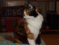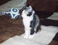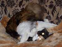 ДжессикаОднажды по телевизору смотрели передачу о животных, в которой рассказывали о Курильских бобтейлах. Мы сразу же влюбились в эту породу, стали изучать литературу, искать в Интернете информацию о ней. Наконец мы приняли решение приобрести себе нового члена семьи. Это была маленькая беззащитная кошечка с милой симпатичной мордочкой с симметричным окрасом. Когда она у нас появилась, ей был 1 месяц. Как только мы принесли ее домой, она сразу же, не испытывая чувства страха, стала осваивать территорию. Моментом нашла лоточек с туалетом и миски с едой. Назвали мы ее Джессикой. Месяцев до 3-х спать ложилась с меховой подстилкой, считая ее своей мамочкой, и начинала громко чавкать. Игрушками она признавала все что попадалось ей на пути: ножки от табуреток, столы, наши ноги, пакеты, ну и конечно же игрушечные мышки, с которыми она носилась по всей квартире, таская их в зубах с места на место. Став постарше стала изучать как открываются дверки мебели, а забравшись в какой-нибудь ящик, начинала выкидывать оттуда мелкие предметы, считая их своими игрушками. Джессика очень ласковая, постоянно будит нас по утрам, мурлыкая, и лижет лицо, тыкаясь мордочкой. Кошка очень прыгучая, во время игры с мышкой на веревочке делает ошеломительные сальто. Летом выезжали на дачу, так выгнать ее из травы было невозможно, она целыми днями охотилась на бабочек, мух и кузнечиков. Джессика постоянно находится там, где мы. Если остается одна, то начинает звать, чтобы открыли дверь или вышли к ней. Очень любопытная, обследует все новое, а когда работают какие-либо механизмы без нее не обойтись, она тут же изучает что откуда и для чего. Очень любит смотреть смотреть телевизор. До Джессики у нас была домашняя кошка, с кошкой Курильского бобтейла не сравнить. Если сомневаетесь в выборе – мы рекомендуем эту породу, не ошибетесь! |