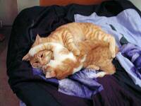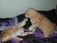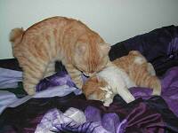 Бабушка, которая живет в далеком поселке Краснодарского края, будучи у нас в гостях и увидев Батюшу, сказала: «Вот такого котеночка я бы хотела! Будет у Батюши сыночек, вы уж, привезите мне!» Сказано – сделано. Как раз от второго брака у Батюши сын рыженький родился. Но в деревушку короткохвостого не повезешь: всех девок перепортит, все деревенское потомство полухвостым сделает! Придется Герочку (по паспорту Гордэй) кастрировать, а до того, будет жить в Москве, делить жилплощадь с собственным папенькой – Батюшей Крошкой Флэк. Мы, конечно, пытались Батюше объяснить, что это – СЫН, что только месяцев на восемь, погостить. Но куда там! Не поверил, ни единому слову. Он же точно знает: раз в доме чужой кошатиной пахнет, значит новая невеста пожаловала! Слава богу уже трижды – отец! Невесты разные попадались: и многоопытные, знающие себе цену дамы, и вовсе зеленые девицы… И с каждой Батюша непременно находил общий язык. А тут, нашла коса на камень! Да и пахнет невеста как-то не очень… Но Батюша наш, врожденный интеллигент, да и терпения не занимать. Залег, сложил лапки кренделем, стал ждать – поглядывать, пока Герочка,«невеста», освоится. А Герочка освоился быстро. Как и положено трехмесячному котенку, стал резво бегать, лазать, игрушки по полу гонять. Батюша понаблюдал и решил, что пора к делу. Проявил некоторую настойчивость и… схлопотал по морде! Да здорово так! Но как истинный джентльмен отнес это все на дамские капризы. Наверное решил, что опять «девица зеленая» попалась. Решил ухаживать аккуратненько. Стал ходить вокруг да около, подмяукивать, за ушко Герочку покусывать, и даже шерстку ему вылизывать! Да…. Чего ради любви не сделаешь! Герочка все ухаживания принимал благосклонно, как должное, но «девочкой» от этого становиться не хотел. Чуть что – по морде давал, с мявом и шипом! Помучился наш Батюша, помучился, а потом решил, что, видимо, эту «невесту» ему еще выращивать и воспитывать придется, пока из детсадовских штанишек вырастет. Смирился и стал вести себя, как настоящий любящий отец. А на нас Батюша сильно обиделся за то, что в доме еще кошка появилась. Оскорбился. Нет, виду особо не подавал, ел нормально, прохаживался, как обычно. Но…. МУРЧАТЬ ПЕРЕСТАЛ!!! Совсем. Вот ужас-то. Это такой кошмар, когда ваш любимый кот ведет себя, как обычно, даже гладить себя позволяет, но НЕ МУРЧИТ! Будто моторчик у него внутри сломался. Тогда Алинка решила: «Будем его лечить. Насильно любить его буду!» И брала Батюшу на руки, и прижимала к себе изо всех сил, и почесывала, и целовала дня три подряд и…. «растопила», наконец, его сдержанность. Размурчался наш гордый, независимый Батюша, простил!!!