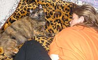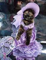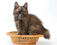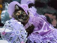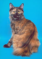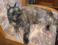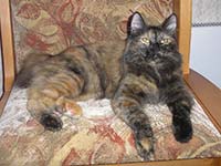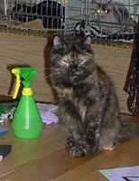 Баядера Крошка ФлакСН (WCF), СН(WCA) Замечательная черепашка Баядера Крошка Флак (Бо) появилась у нас 13 ноября 2005 года. История ее появления необычна – поэтому я решила поведать о ней отдельно. Я давно мечтала завести кошку, иногда посещала выставки и приметила породу курильский бобтейл, как идеального компаньона для содержания в квартире: умные, обожают хозяев, выдержанные (не липучки), не шумные, без запаха. Наша знакомая Марина (владелица шикарного кота Незнайки) подарила календарик, на котором была кошка-черепашка в атласном платье. Я с первого взгляда влюбилась в красотку и сказала супругу, что хочу только такую. Марина пригласила нас на выставку 12-13 ноября «Звезда». Представляете мое удивление, когда в соседнем манеже с котом Незнайкой я увидела ту самую красотку с календаря. Красотку звали Баядера и как оказалось она призер многих выставок. Бо возлежала в манеже и лениво водила лапкой по передней панели манежа, привлекая внимание посетителей выставки. Баядере было 10 месяцев и на нашу удачу она не нашла себе достойных хозяев к этому моменту. Марина познакомила нас с владельцами питомника Людмилой и Александром Оганесянами. Вероятно все, что я чувствовала к Бо читалось в моих глазах и эти удивительные люди ПОДАРИЛИ мне Баядеру прямо на выставке! Они много рассказали нам о характере и привычках Бо, о том, что она прекрасно ведет себя на выставках обладает прекрасным характером и при этом жуткая трусиха (боится новых мест). Я везла домой Бо и не верила своему счастью, а супруг не верил в происходящее и предполагал, что из дома нас выгонят родители. Он не угадал – все сложилось замечательным образом. Бо «побоялась» немного в узкой щели под кроватью, из которой мы не могли ее вытянуть, а потом пошла «завоевывать сердца» бабушки и дедушки – залезла на диван, урчала «бодалась» и предлагала себя погладить. Она делала это настолько элегантно и артистично, что бабушка и дедушка сдались без боя. С тех пор она принцесса. Она ласковая и умная. Чужих опасается и в руки не идет, но своих знает и любит. Только ей дедушка «уступает» свое место на любимом диване: Бо ложится плотно рядом с дедушкой, занимает явно неудобную позу, упирается лапами и изображает что ей нереально тесно (хотя остальной диван пустой!?) – дедушка отодвигается и так до тех пор пока место не освободиться. Бо любит поиграть и как безумная гоняется за палочкой с перьями или гоняет «бильярд» (круглая игрушка со множеством отверстий и шариком внутри). Младшего сына (8 лет) она побаивается – не любит шумных детских игр с криками, автоматами и саблями. Дочку же (14 лет) обожает, признала хозяйкой и обязательно приходит ее будить утром мурчательно-бодательной процедурой. Баядера не терпит закрытых дверей и даже если дверь плотно заткнута газетой делает «захват» двери лапами снизу и «отжимается» пока не откроет дверь.