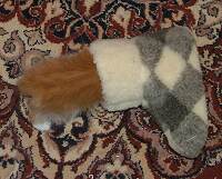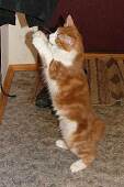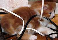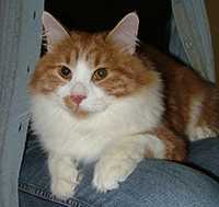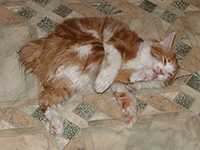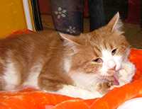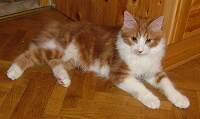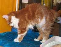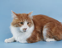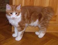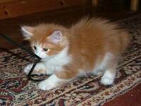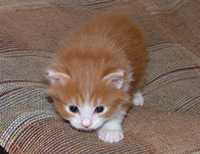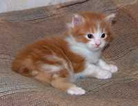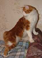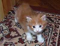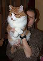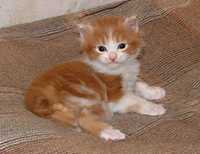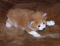 Минотавр Крошка ФлакМинотавр (в семье – просто Тавр), единственный кот в помете, обладатель чудно закрученного хвостика и роскошного белоснежного жабо, отличается четкостью красного мрамора в окрасе. Кроме того, основные черты его характера – спокойствие и любовь к хозяйке. |