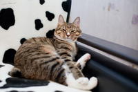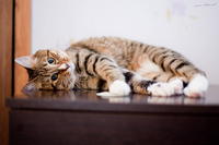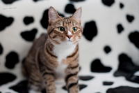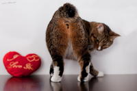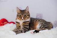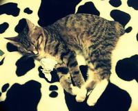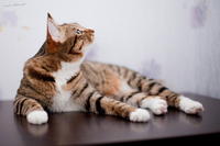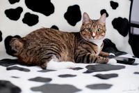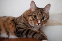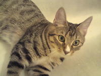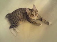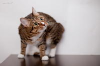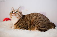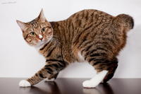 Саванда, появившись в нашем доме чуть меньше года назад, ненавязчиво и деликатно (как и все, что она делает) завоевала сердца всей семьи просто в два счета. Наша маленькая зеленоглазая охотница терпеть не может сидеть на руках. Зато когда мы приходим с работы, еще в подъезде слышим, как она пищит через дверь от радости, что наконец-то люди дома и сейчас будут с ней играть и ОБЩАТЬСЯ! Общаться с хозяевами Саванда любит даже больше, чем консервы, и считает, что это главнейшая их обязанность в жизни В одиночестве она скучает и грустит, а больше всего на свете ненавидит комьютеры и ноутбуки, которые отнимают у нее хозяев. Если Саванду ругают за проступок, она не обижается и не злится, а очень расстраивается, уходит на подоконник и долго-долго печально смотрит вдаль. Проступок, чаще всего, потом больше не повторяется. Мы выставлялись только один раз, но вполне успешно – Саванде присудили Best Opposite Sex и 10 место на ринге WCF среди взрослых кошек, титул чемпиона породы WCF с оценками «отлично», а также оценку «отлично» для титула CACIB. Больше выставляться в ближайшее время мы не планируем, т.к. наша трусишка очень переживала на выставке, активно линяла и отказывалась есть. Надеемся в скором времени на встречу с достойным женихом и на прибавление в нашем курбобском семействе.